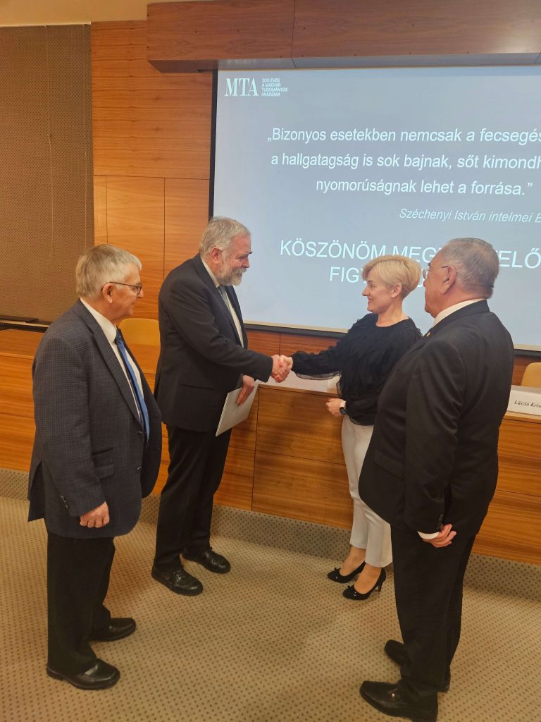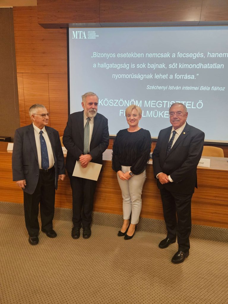 (A fényképen: Lénárd László, akadémikus, a PAB volt elnöke; Kollár László akadémikus, az MTA főtitkára; Lehocki-Samardzic Anna, az eszéki körzethez tartozó tudósok és kutatók képviselője; Kovács L. Gábor akadémikus és a PAB elnöke.)
